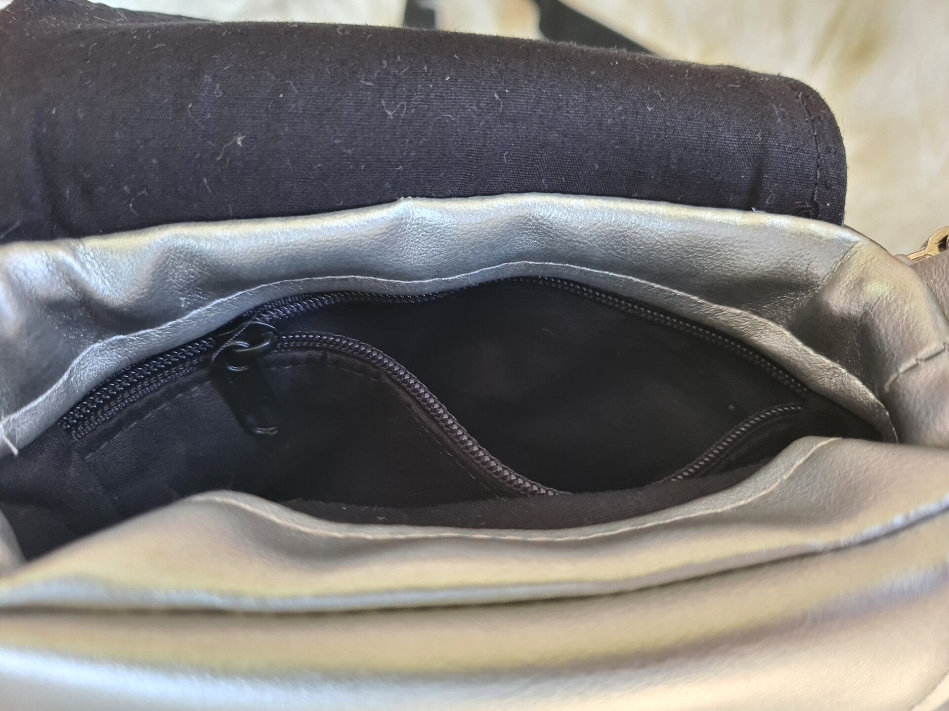 Diese Handtasche besitzt drei Taschenklappen, die mit Druckknöpfen geschlossen werden. Unter der Obersten verbirgt sich ein geräumiges Innenfach für Handy, Geldbörse, Taschentücher, sowie ein kleines, in der Haupttasche integriertes Reißverschlussfach für die Wertsachen. Unter den 2 weiteren Klappen verbergen sich 2 unterschiedlich hohe aufgesetzte Taschen, in denen weitere Kleinigkeiten verstaut werden können. Der Clou ist die Reißverschlusstasche hinten. Der Reißverschluss verläuft schräg über eine weitere Tasche. Handlich und Kompakt kann diese Umhängetasche dein ständiger Begleiter für den Abend werden. Selbstverständlich kannst du die Tasche auch tagsüber tragen :-).