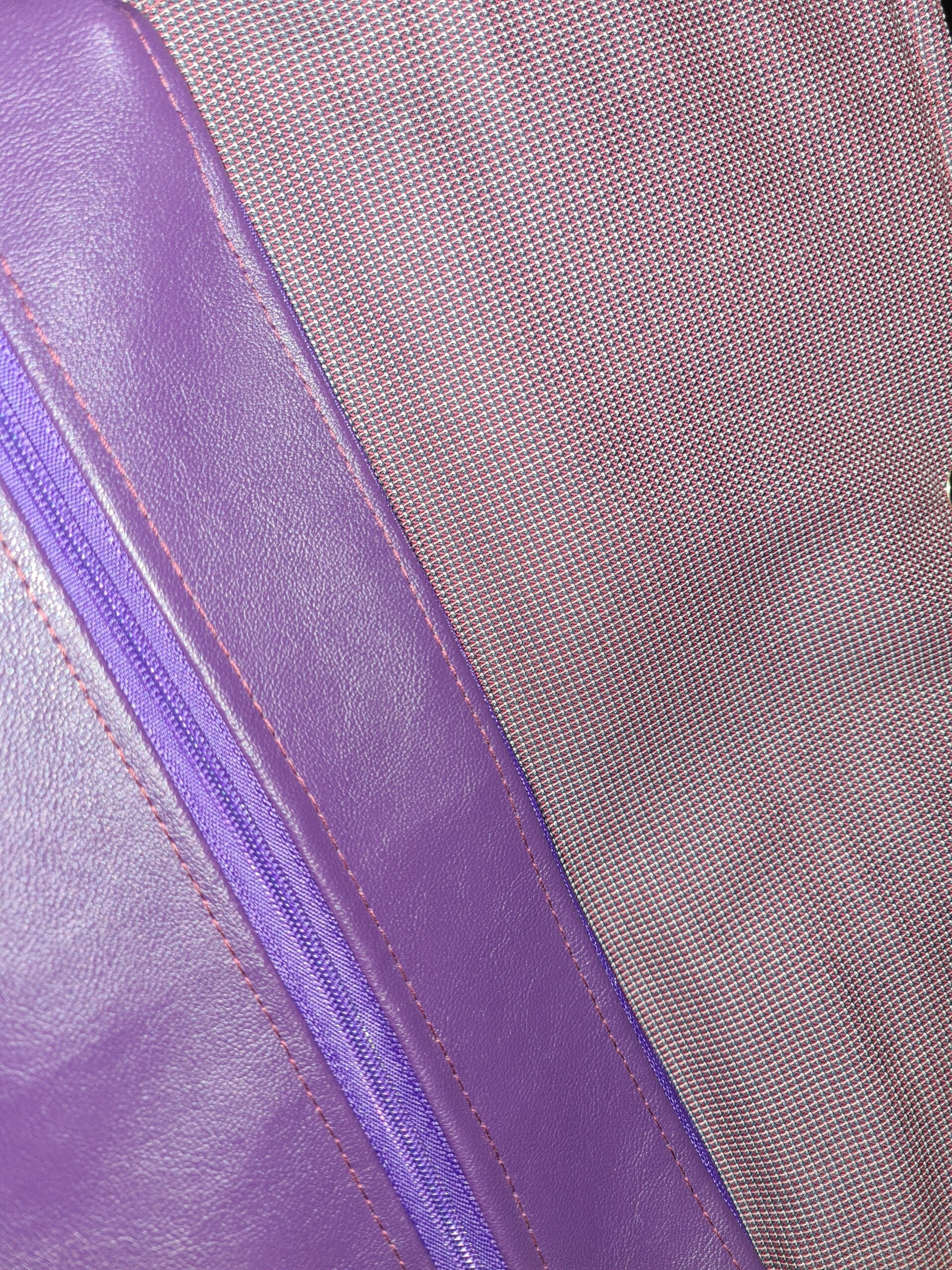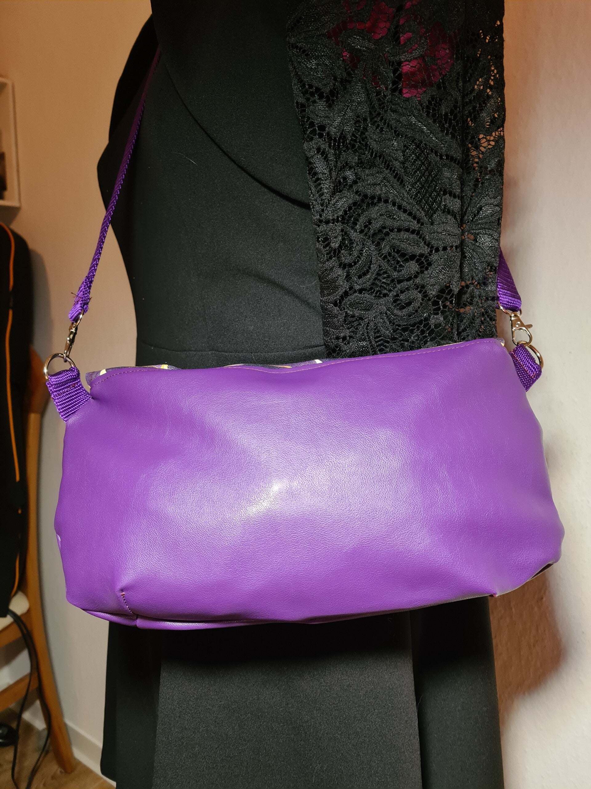 - Material: Lila Kunstleder für die Tasche, lila-goldenes Kunstleder für die Klappe
