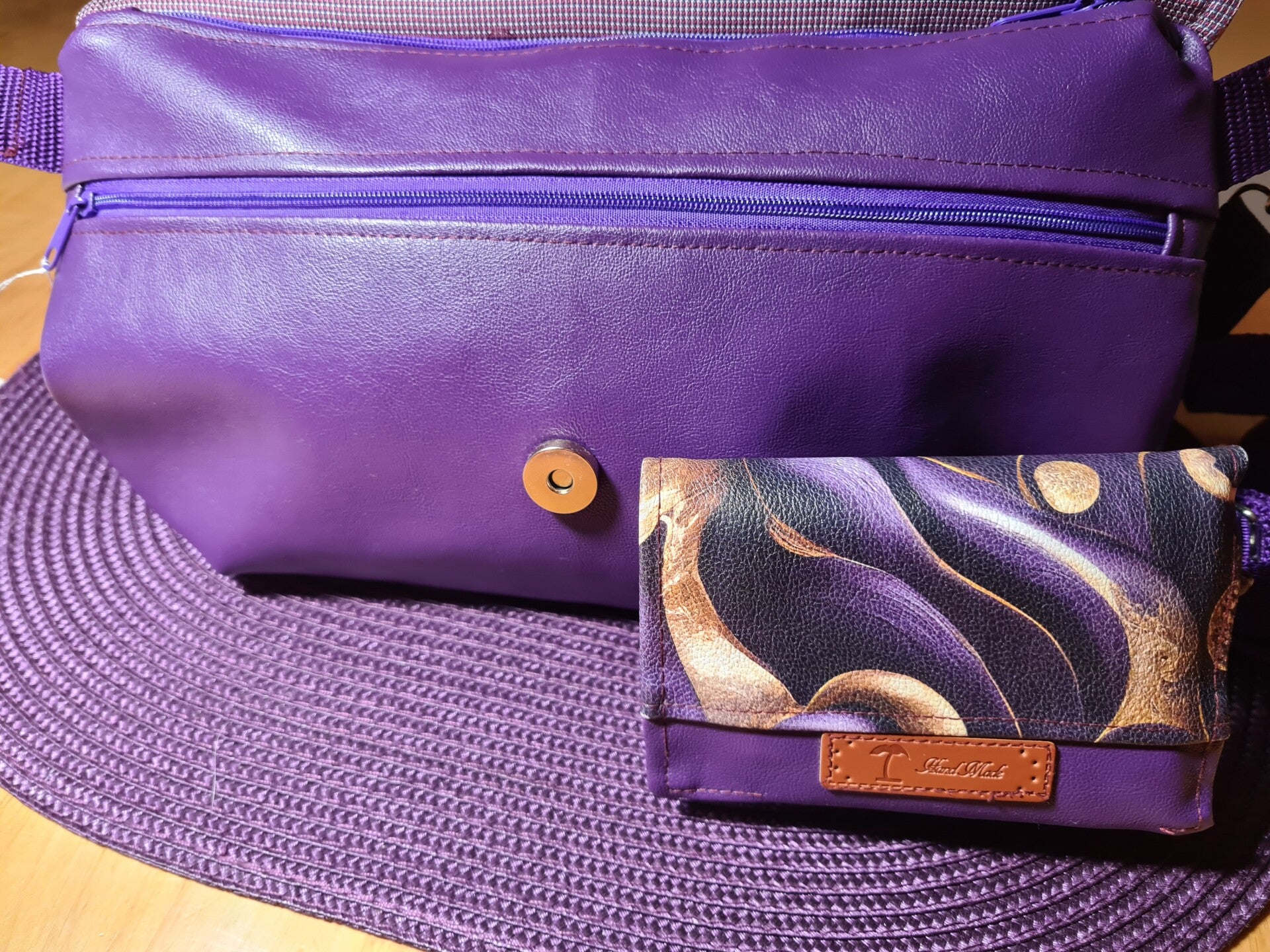 Handgefertigte Umhängetasche aus lila Kunstleder mit goldenen Akzenten – Stilvoll und Praktisch