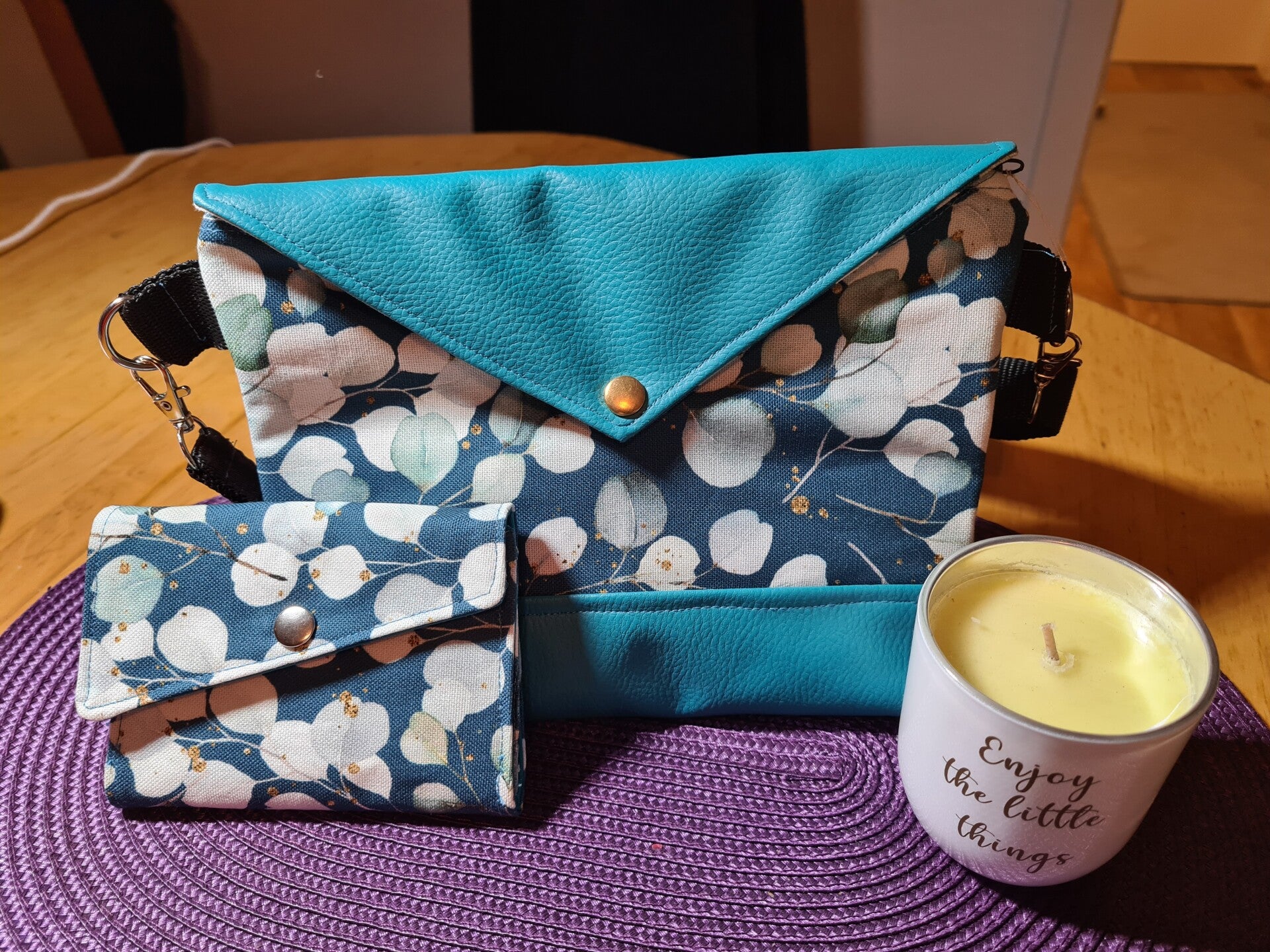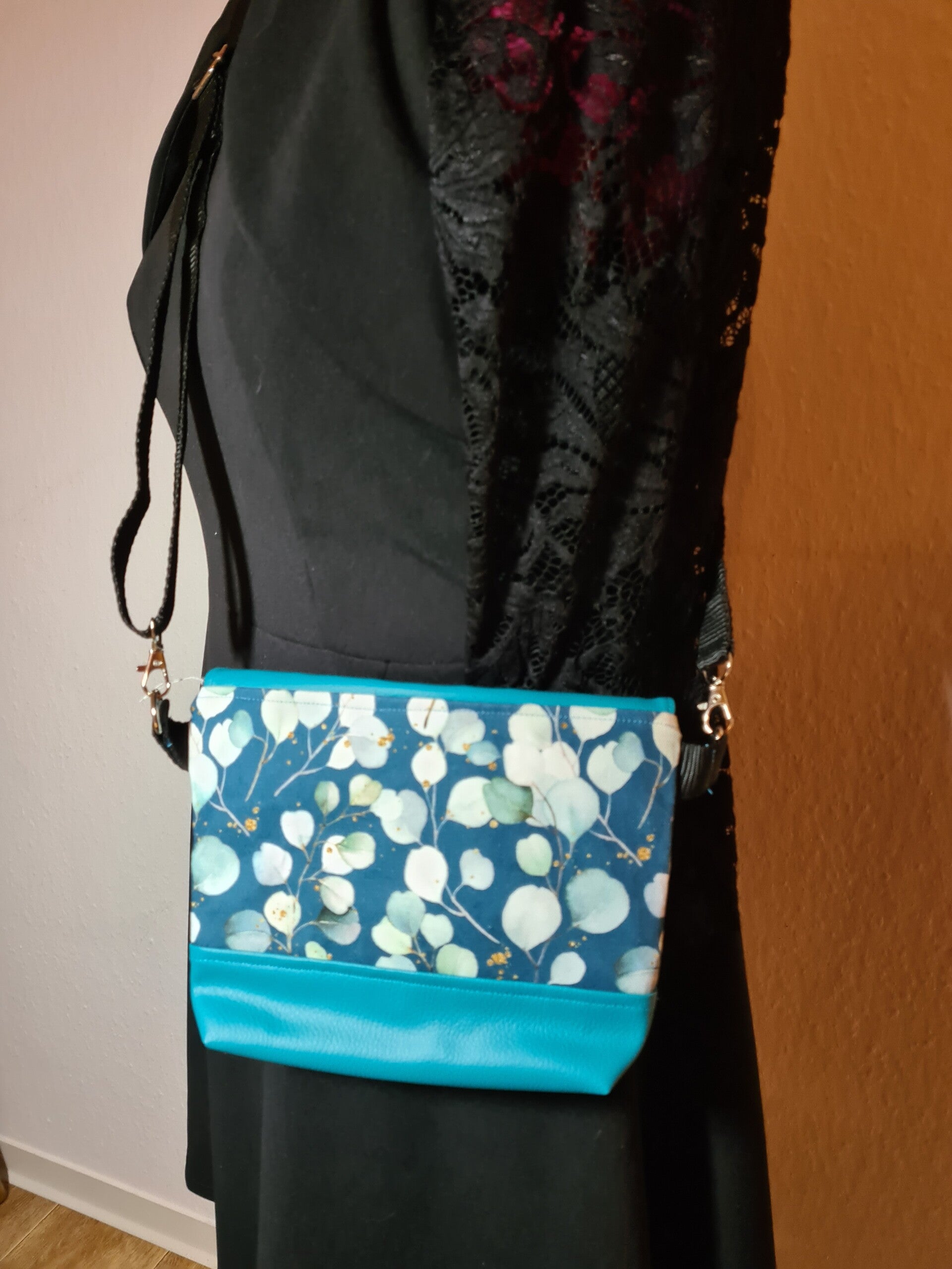 Handgefertigte Umhängetasche, Umhängetasche Eukalyptus Motiv, petrolfarbene Tasche, Kunstleder Tasche, handgemachte Tasche, Canvas Tasche, Eukalyptus Design, Umhängetasche mit Reißverschluss, Umhängetasche mit Klappe, modische Tasche, Tasche mit Druckknopf, Tasche für Damen, Umhängetasche aus Kunstleder, handgefertigte Accessoires, Tasche für den Alltag, verstellbares Gurtband, Umhängetasche mit Innentasche, Umhängetasche in petrol, handgemachte Kunstledertasche, Umhängetasche aus Canvas.