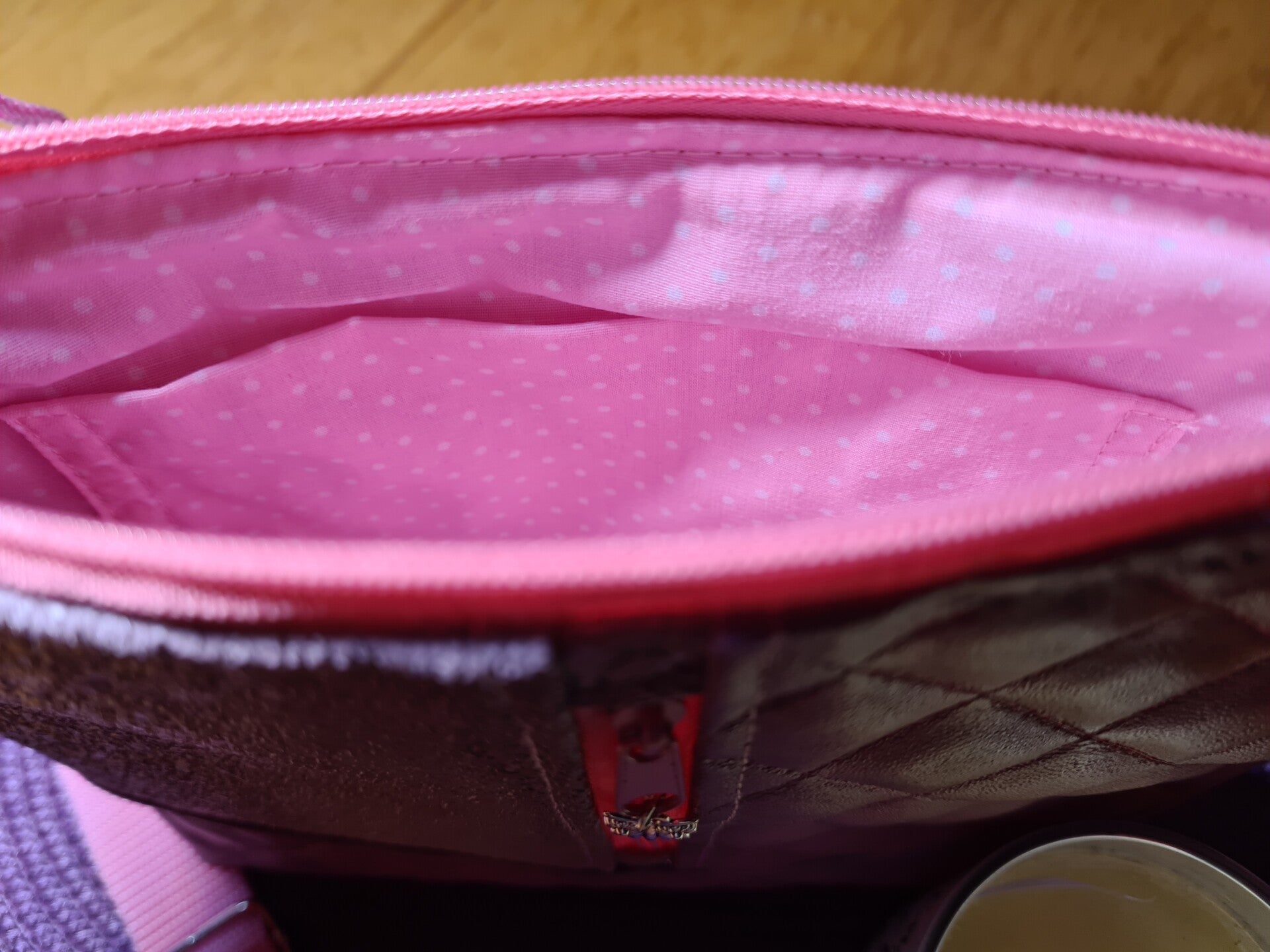 Sie hat eine "große " Innentasche, an der eine kleine Innentasche ca 10x14cm aufgesetzt ist. Hinter dem gesteppten Kunstleder versteckt sich ein kleine Tasche.