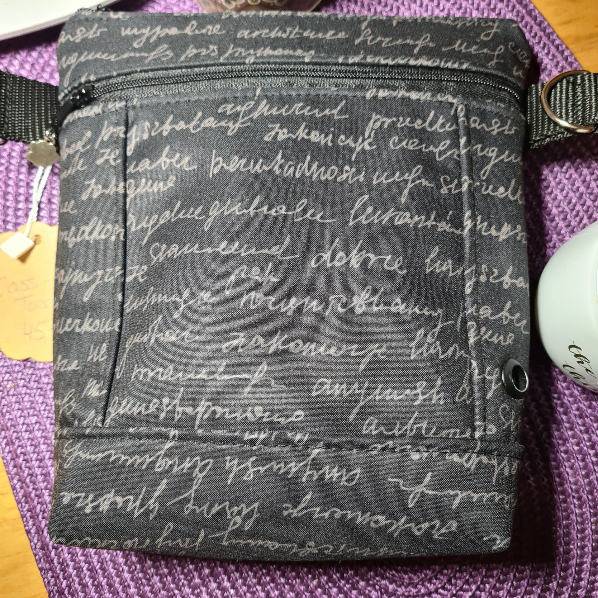 Verschlossen wird sie mit einem Reißverschluss am Hauptfach. Vorne an der Tasche befindet sich eine weitere Reißverschlusstasche mit Öse für Kotbeutel/Leckerchen oä. Alle wichtigen Dinge fürs Gassigehen finden Platz in der Tasche.