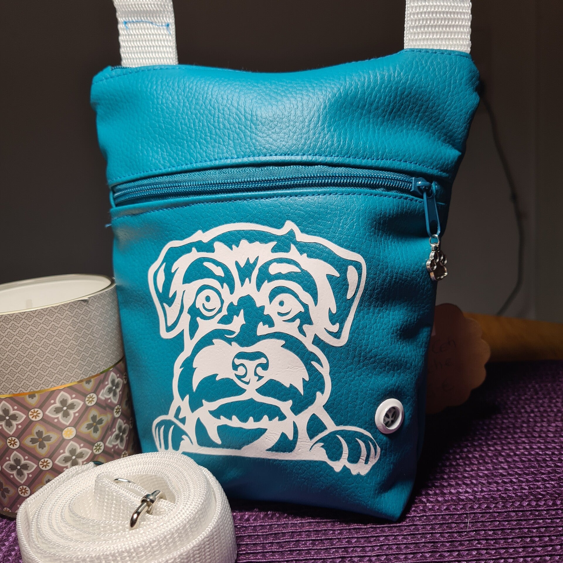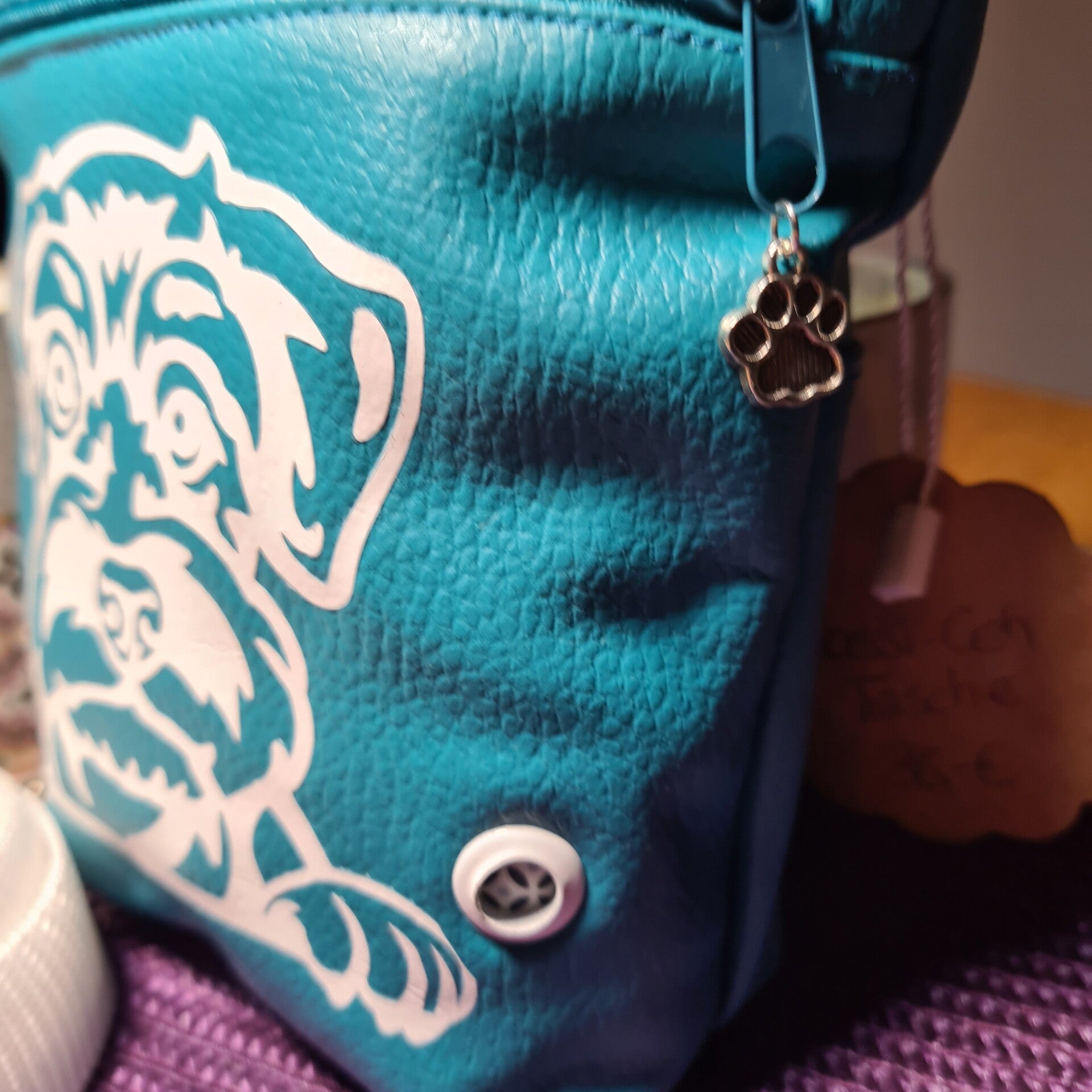In der Haupttasche kannst du dein Handy, Schlüssel, Geldbeutel und/oder Leckerlies verstauen. In die vordere Tasche ist eine Öse zur unkomplizierten Entnahme von Kotbeuteln integriert.