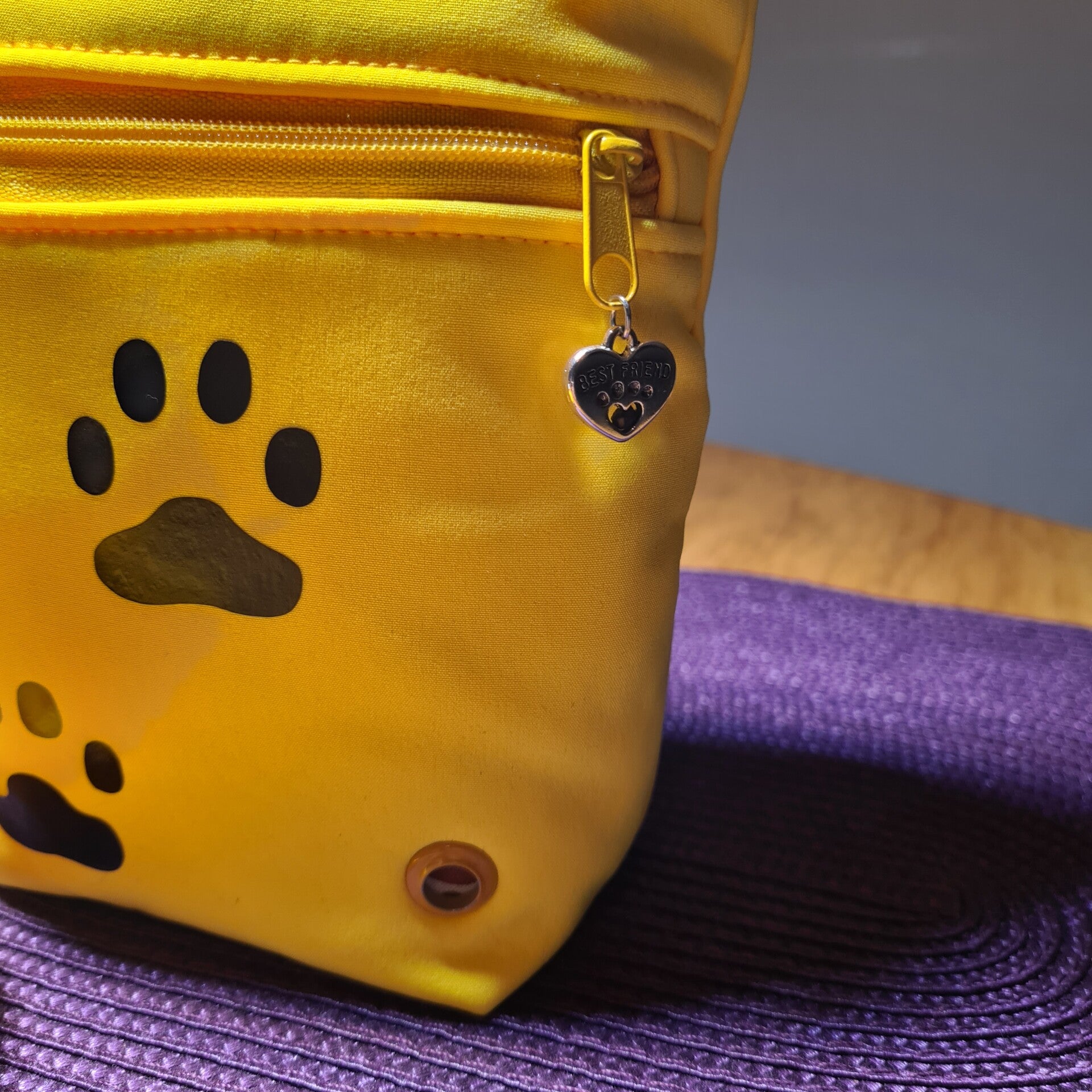 In der Haupttasche kannst du dein Handy, Schlüssel, Geldbeutel und/oder Leckerlies verstauen. In die vordere Tasche ist eine Öse zur unkomplizierten Entnahme von Kotbeuteln integriert.
