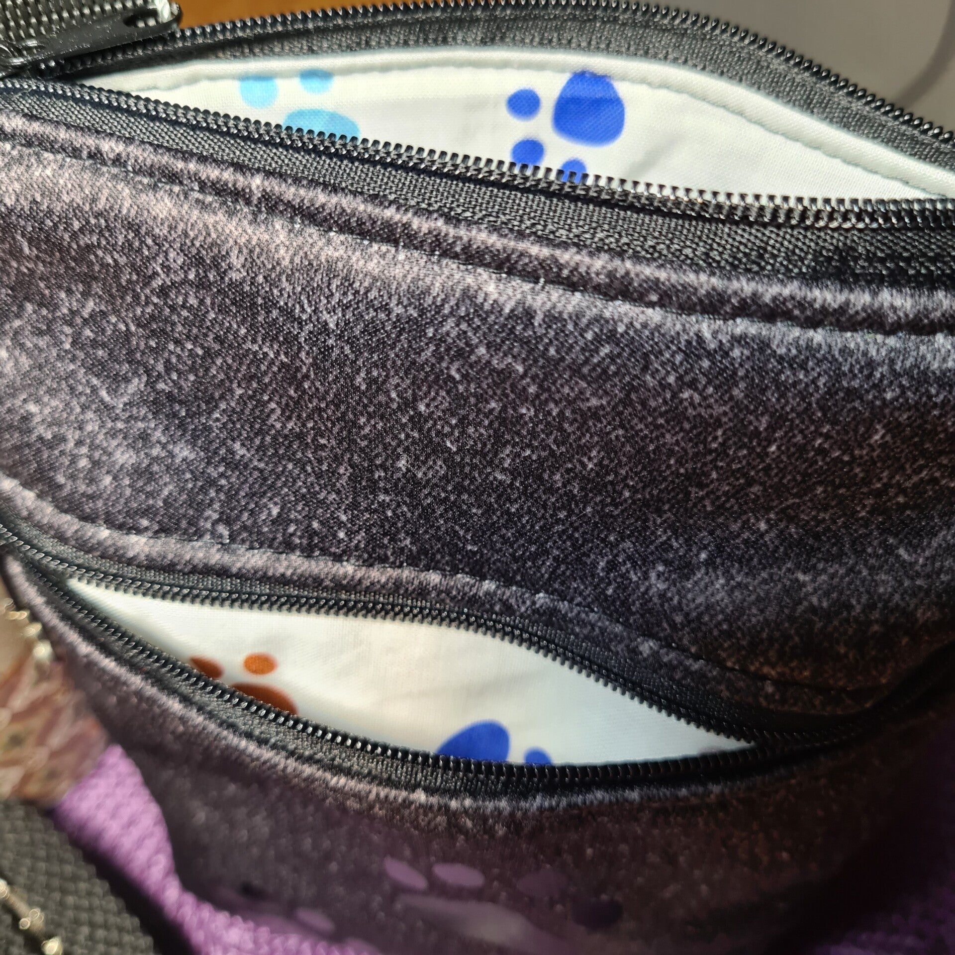 In der Haupttasche kannst du dein Handy, Schlüssel, Geldbeutel und/oder Leckerlies verstauen. In die vordere Tasche ist eine Öse zur unkomplizierten Entnahme von Kotbeuteln integriert.