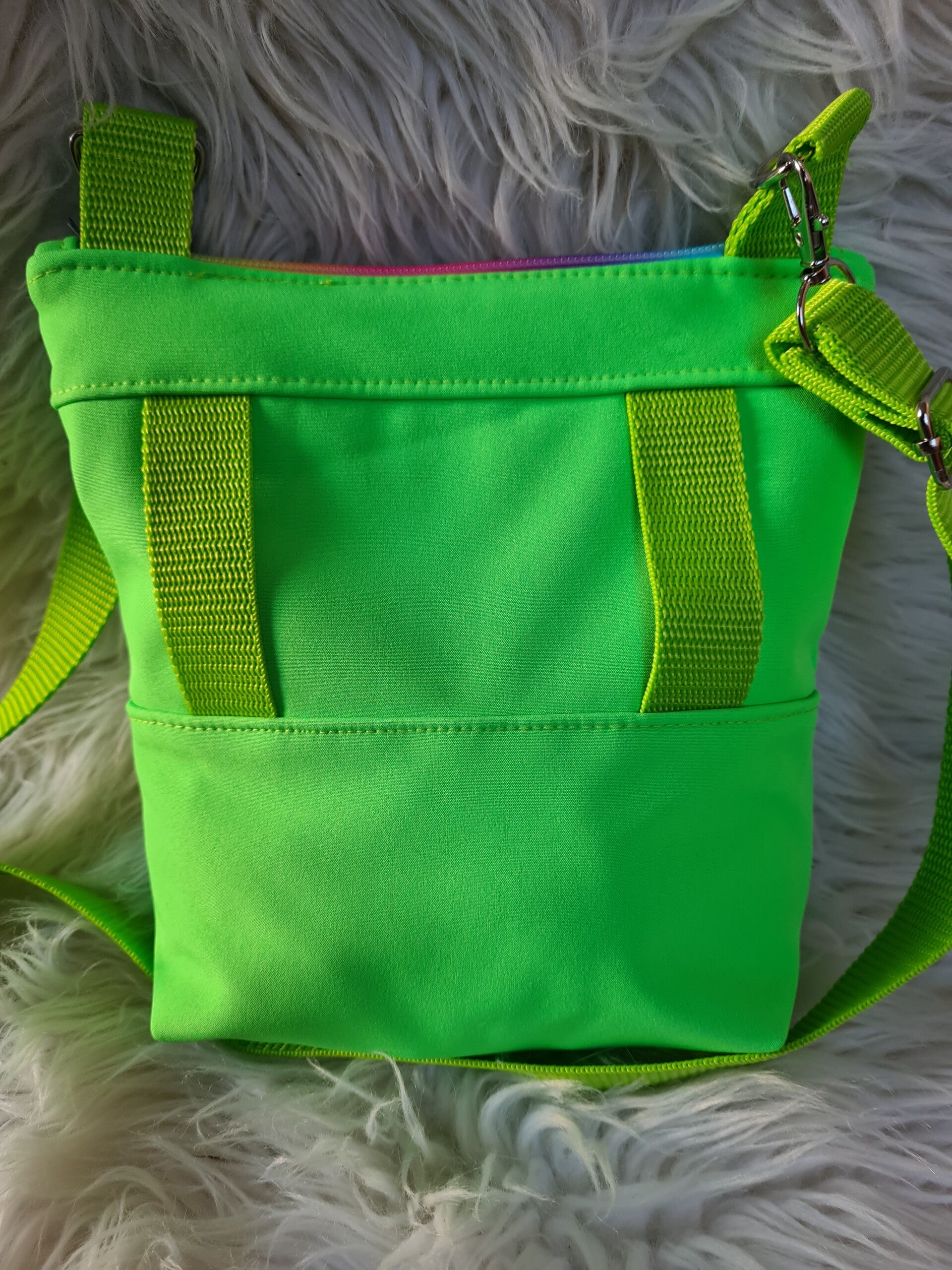 - Material: Neongrünes Softshell (wetterfest und robust)
