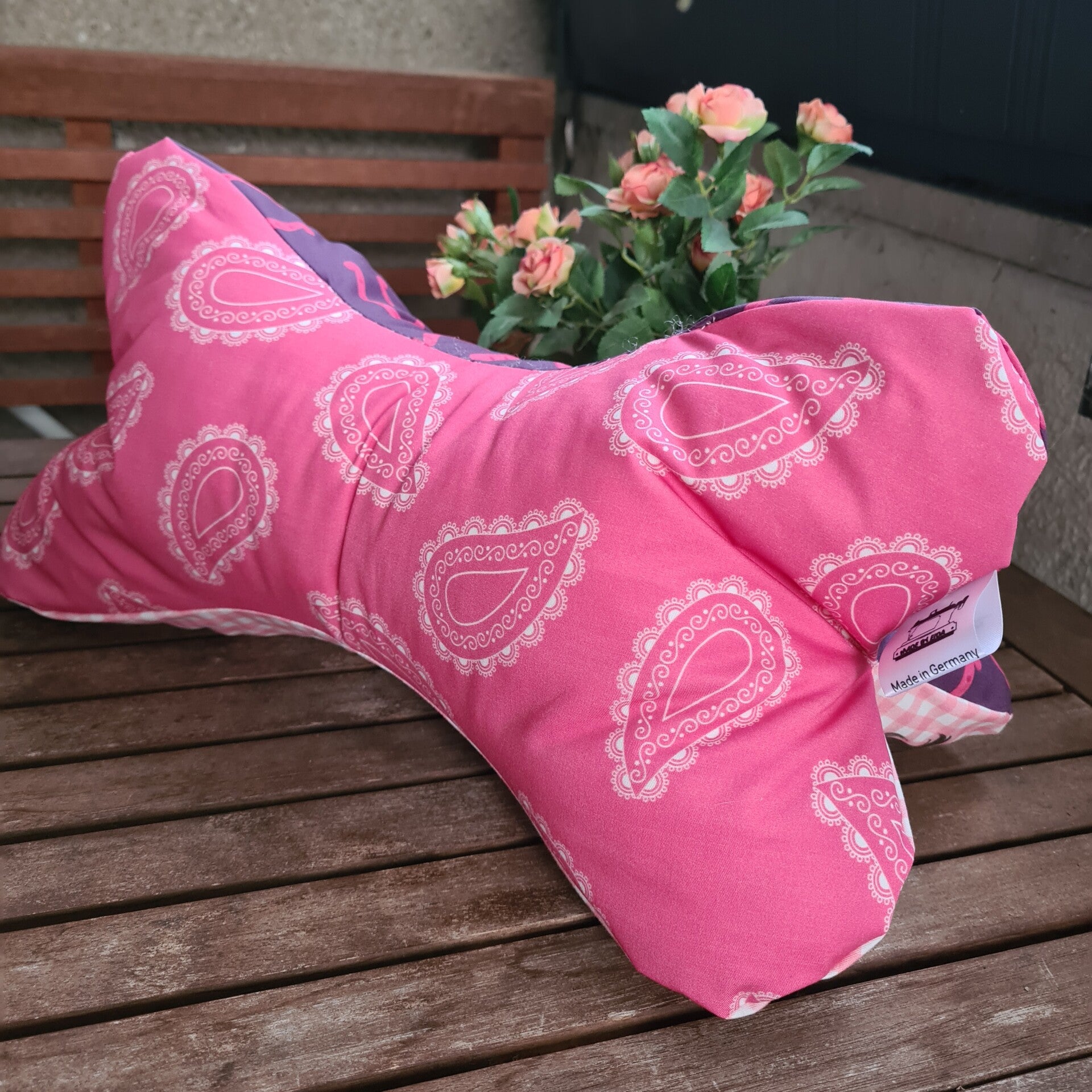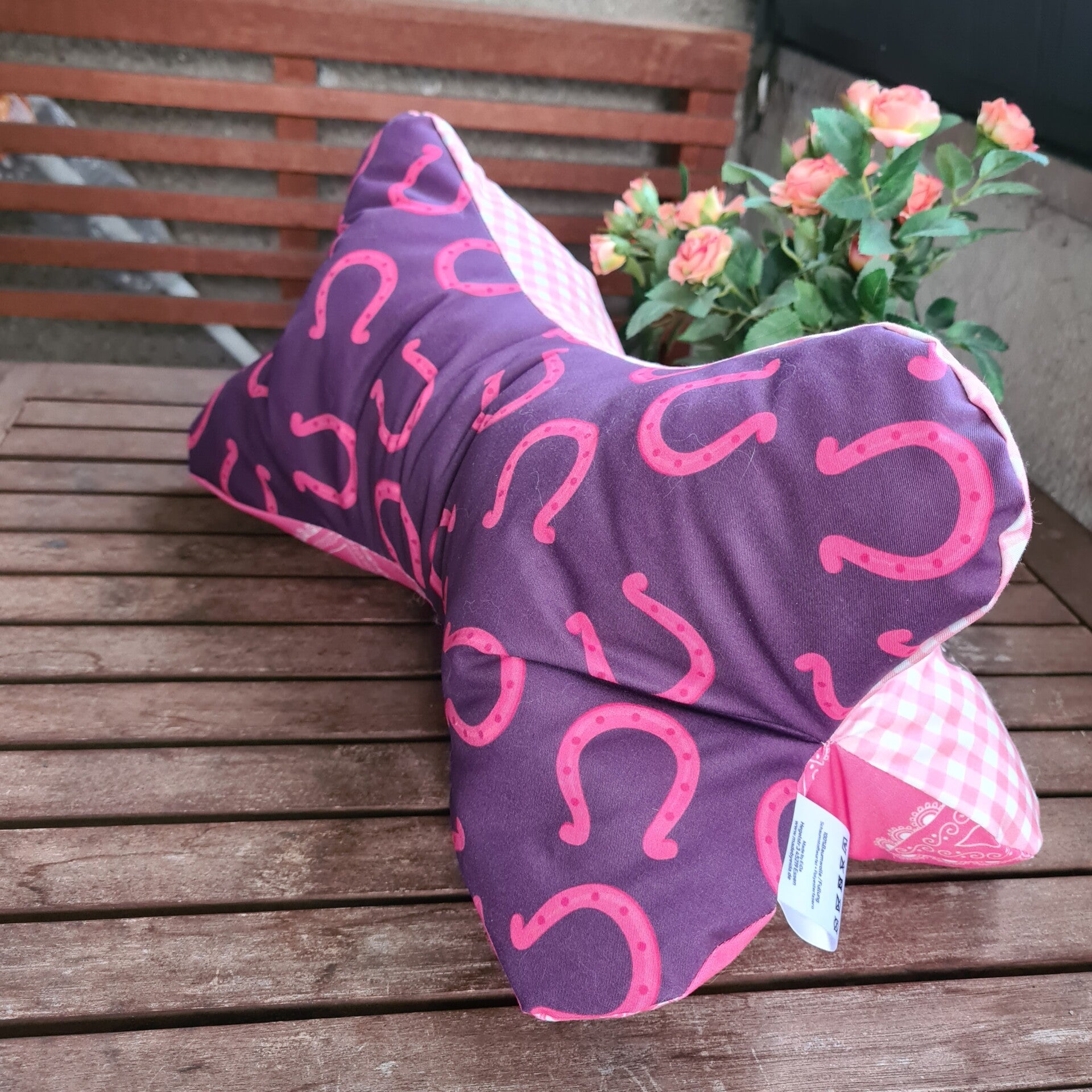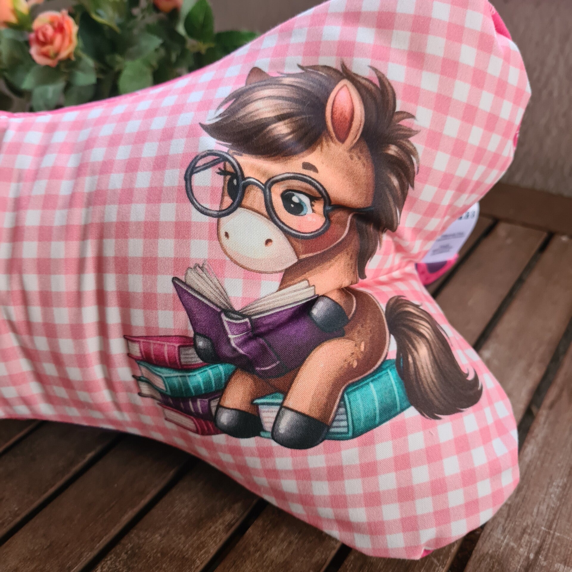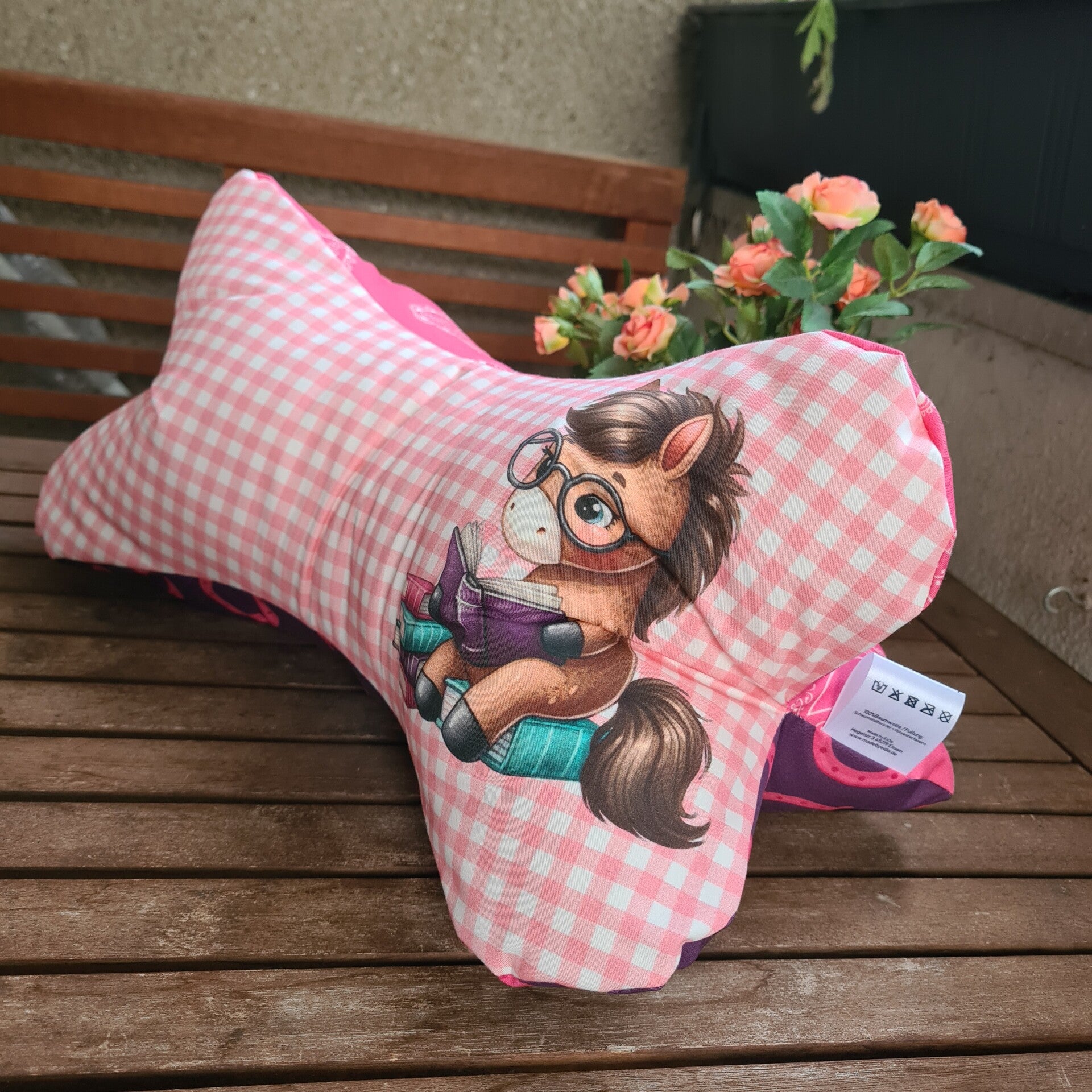 Das Design besticht durch einen liebevoll gestalteten Stoff aus Baumwolle im rosa-weiß karierten Muster mit einem niedlichen Pferdemotiv – ideal für Pferdefans und Kinder wie Erwachsene gleichermaßen.