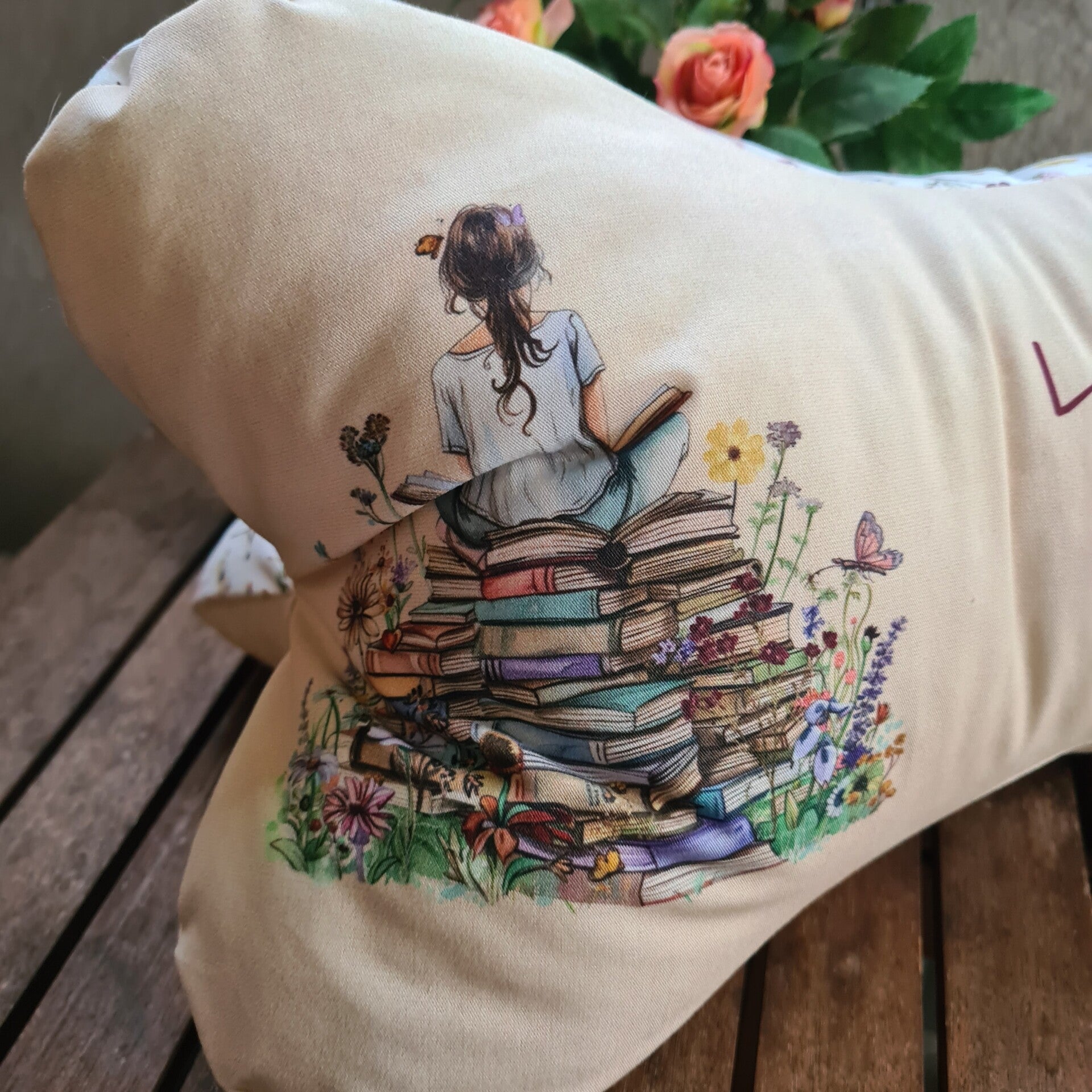 Das besondere Highlight: Auf dem Bezug aus 100% Baumwolle ist eine liebevoll gestaltete Illustration einer Leserin auf einem Stapel Bücher mit Blumen und Schmetterlingen zu sehen. Daneben steht der inspirierende Spruch: