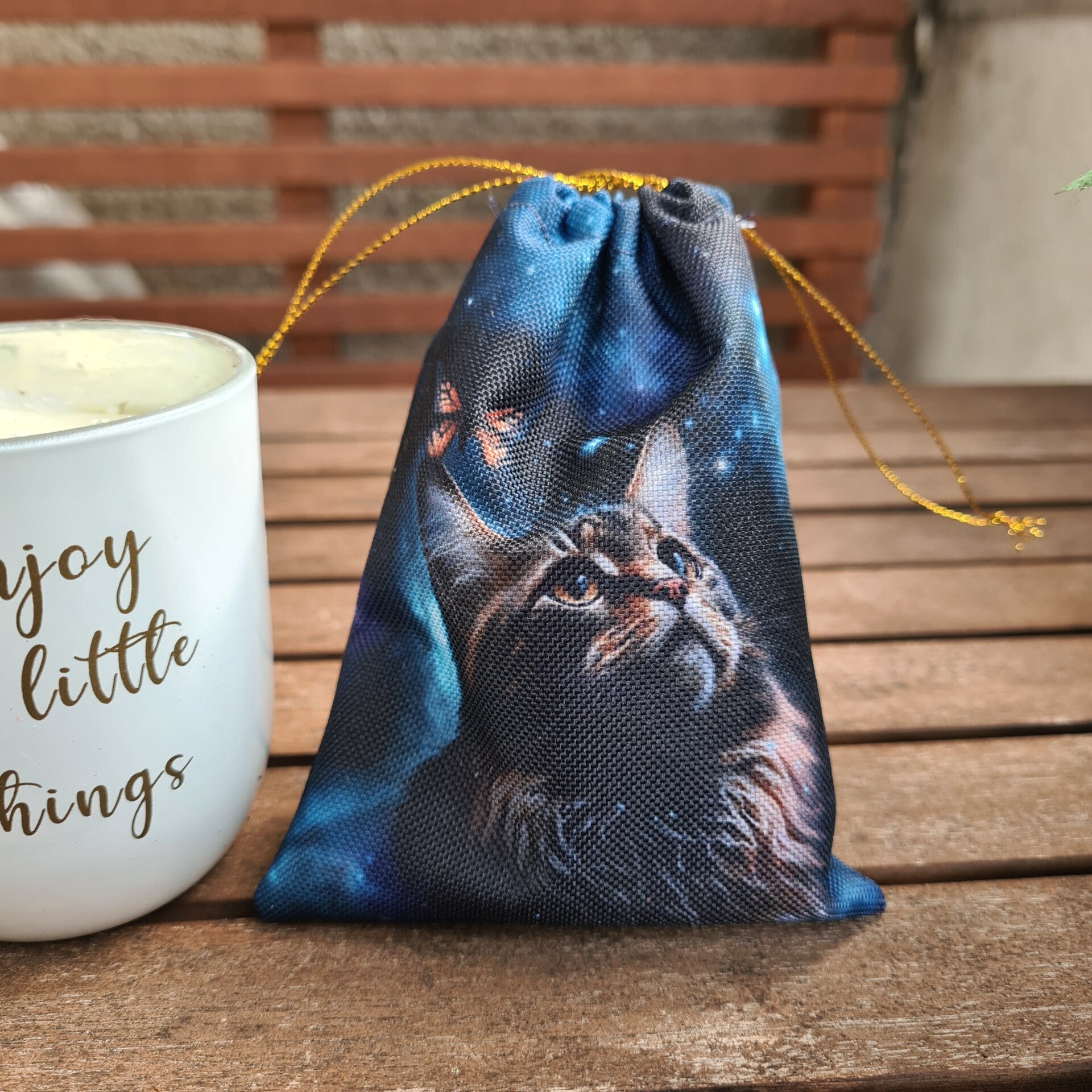 Katzen Stoffbeutel wasserfest 10x14 cm – Handgemacht – kleiner Geschenkbeutel mit Sternenhimmel Motiv, Mystic Cat, Schmuckbeutel, Fantasy De