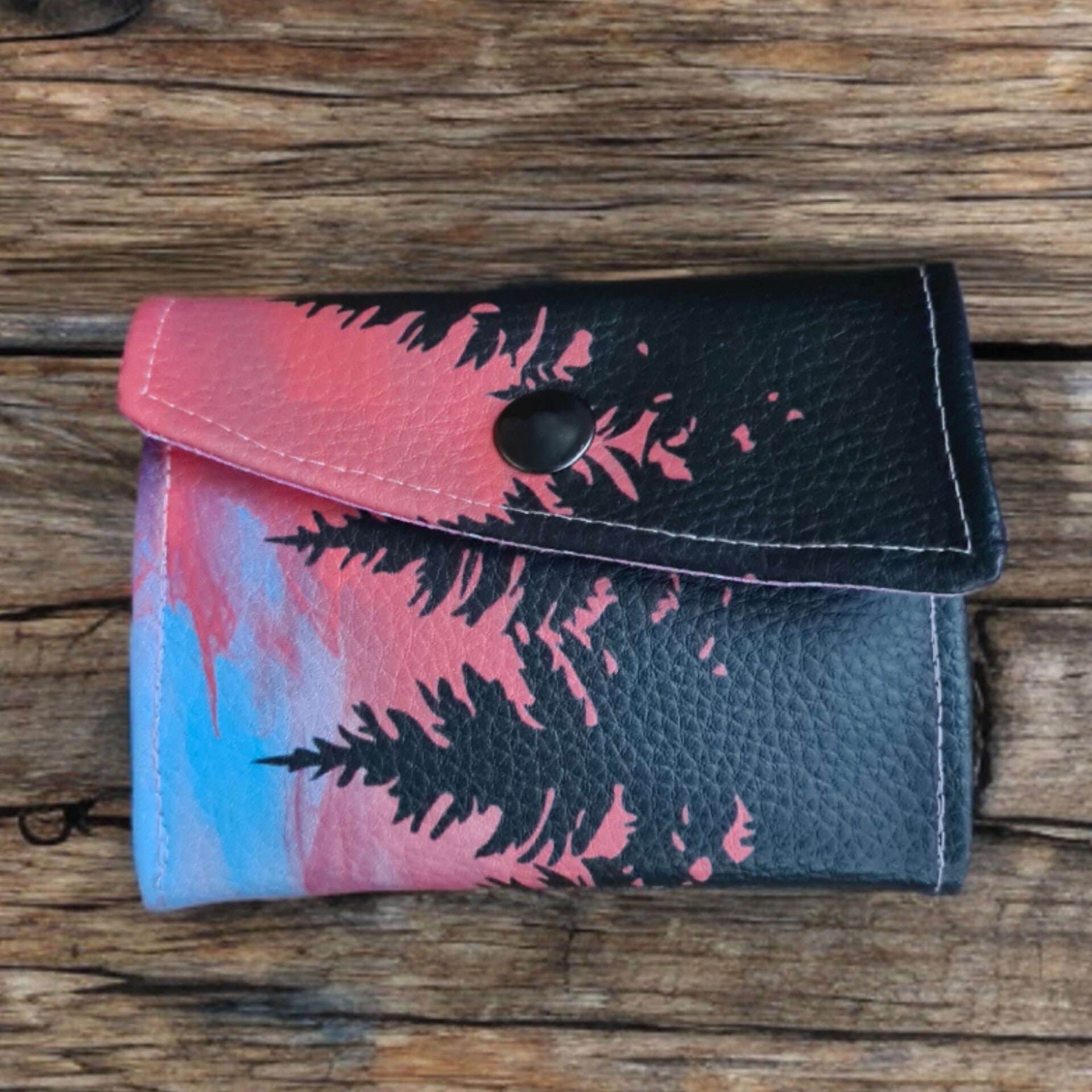 Diese handgefertigte Mini Geldbörse vereint Funktionalität, Stil und Kompaktheit in perfekter Balance. Das moderne Design mit Wald-Silhouette im Sonnenuntergang macht sie zu einem echten Hingucker – ideal für kleine Taschen, Festivals oder unterwegs.